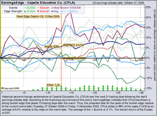 According to the 8 previous quarterly earnings reports, CPLA has shown a bullish edge that peaks 13 trading days after the report. CPLA rallies in 88% of the cases (7 of 8) by an average of + 6.4% relative to the date of the earnings release. At the time this story was written, CPLA is + 4.84% after earnings were released.