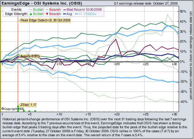 According to the 7 previous quarterly earnings reports, OSIS has shown a bullish edge that peaks 3 trading days after the report. OSIS rallies in 100% of the cases (7 of 7) by an average of + 5.4% relative to the date of the earnings release. At the time this story was written, OSIS is + 4.91% after earnings were released.