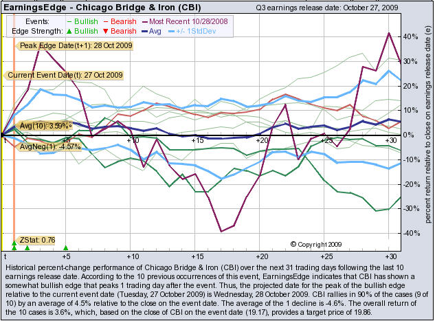 According to the 10 previous quarterly earnings reports, CBI has shown a bullish edge that peaks 1 trading day after the report. CBI rallies in 90% of the cases (9 of 10) by an average of + 4.5% relative to the date of the earnings release. At the time this story was written, CBI is + 6% after earnings were released.