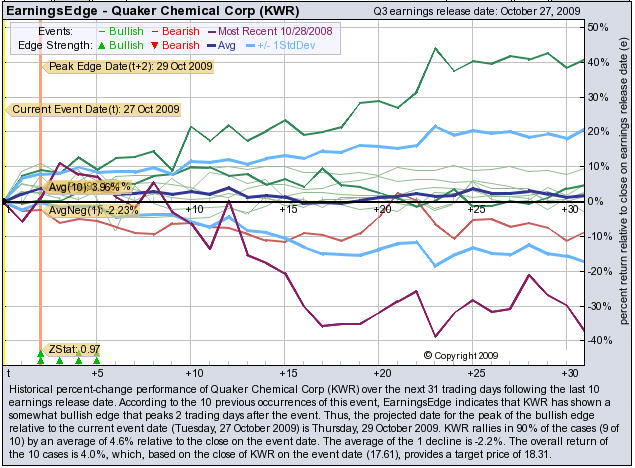 According to the 10 previous quarterly earnings reports, KWR has shown a bullish edge that peaks 2 trading days after the report. KWR rallies in 90% of the cases (9 of 10) by an average of +4.6% relative to the date of the earnings release. At the time this story was written, KWR is +10.39% after earnings were released.