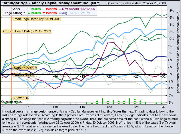 According to the 7 previous October earnings reports, NLY has shown a bullish edge that peaks 2 trading days after the report. NLY rallies in 86% of the cases (6 of 7) by an average of +2.1% relative to the date of the earnings release. At the time this story was written, NLY is +3.94% after earnings were released.