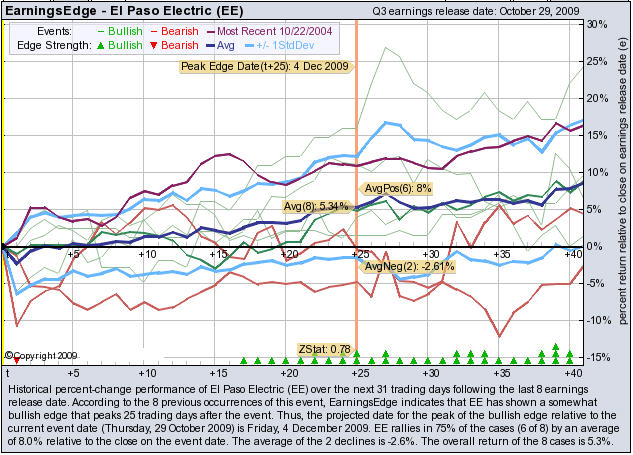 According to the 8 previous October earnings reports, EE has shown a bullish edge that peaks 25 tradings day after the report. EE rallies in 75% of the cases (6 of 8) by an average of + 8.0% relative to the date of the earnings release. At the time this story was written, EE is + 1.45% after earnings were released.