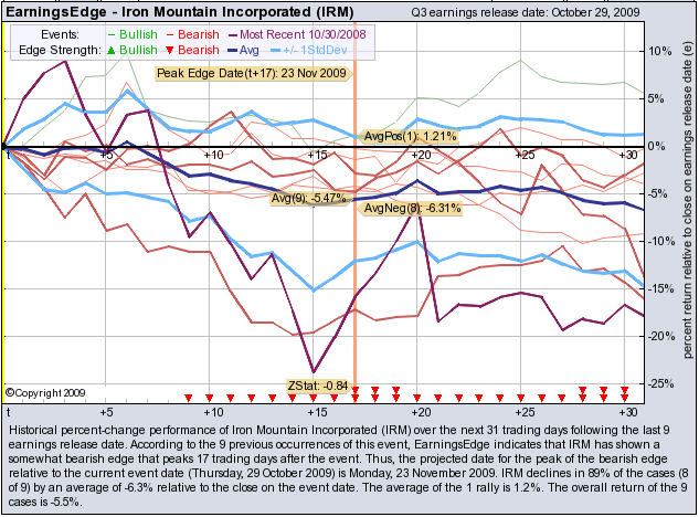 According to the 9 previous quarterly earnings reports, IRM has shown a bearish edge that peaks 17 trading days after the report. IRM drops in 89% of the cases (8 of 9) by an average of -6.3% relative to the date of the earnings release. At the time this story was written, IRM is -2.54% after earnings were released.