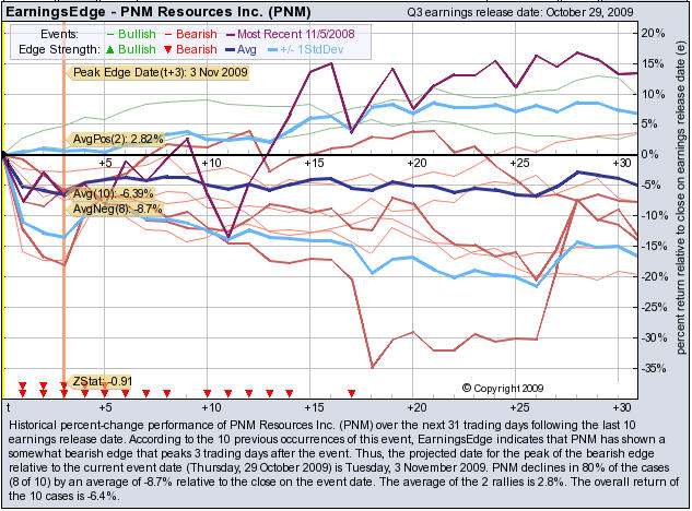 According to the 10 previous quarterly earnings reports, PNM has shown a bearish edge that peaks 3 trading days after the report. PNM drops in 80% of the cases (8 of 10) by an average of -8.7% relative to the date of the earnings release. At the time this story was written, PNM is -4.49% after earnings were released.