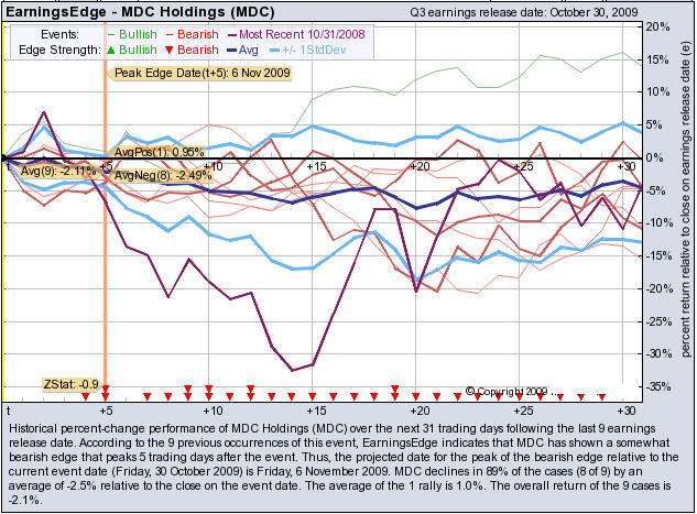 According to the 9 previous quarterly earnings reports, MDC has shown a bearish edge that peaks 5 trading day after the report. MDC drops in 89% of the cases (8 of 9) by an average of -2.5% relative to the date of the earnings release. At the time this story was written, MDC is -4.25% after earnings were released.