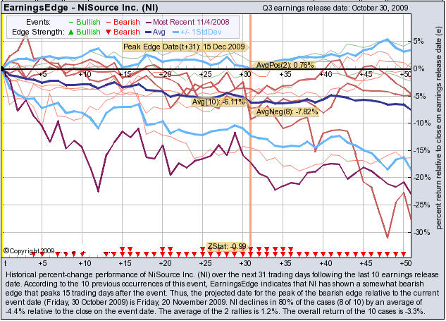 According to the 10 previous quarterly earnings reports, NI has shown a bearish edge that peaks 15 trading day after the report. NI drops in 80% of the cases (8 of \10) by an average of -4.4% relative to the date of the earnings release. At the time this story was written, NI is -2.78% after earnings were released.