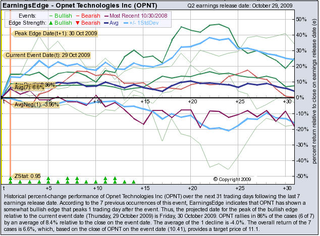 According to the 7 previous October earnings reports, OPNT has shown a bullish edge that peaks 1 trading day after the report. OPNT rallies in 86% of the cases (6 of 7) by an average of + 8.4% relative to the date of the earnings release. At the time this story was written, OPNT is + 5.48% after earnings were released.
