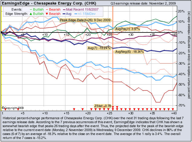 According to the 7 previous November earnings reports, CHK has shown a bearish edge that peaks 26 trading day after the report. CHK drops in 86% of the cases (6 of 7) by an average of -18.3% relative to the date of the earnings release. At the time this story was written, CHK is -2.29% after earnings were released.