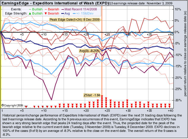 According to the 9 previous quarterly earnings reports, EXPD has shown a bearish edge that peaks 24 trading days after the report. EXPD drops in 100% of the cases (9 of 9) by an average of a"8.3% relative to the date of the earnings release. At the time this story was written, EXPD is a"3.53% after earnings were released.