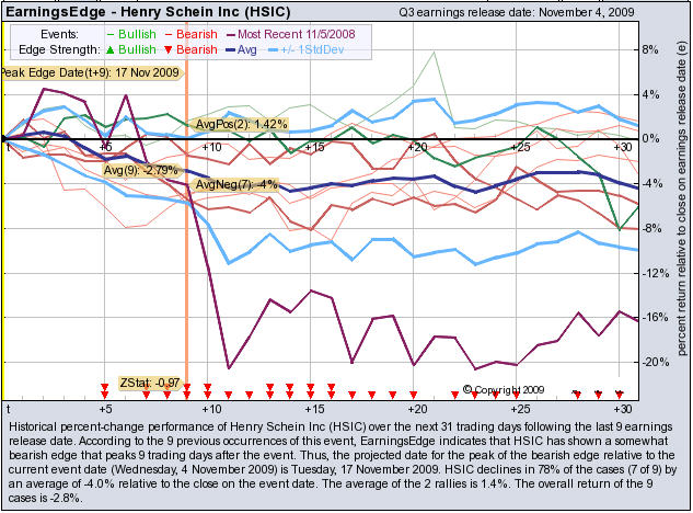 According to the 9 previous quarterly earnings reports, HSIC has shown a bearish edge that peaks 9 trading day after the report. HSIC drops in 78% of the cases (7 of 9) by an average of -4.0% relative to the date of the earnings release. At the time this story was written, HSIC is -5.4% after earnings were released.
