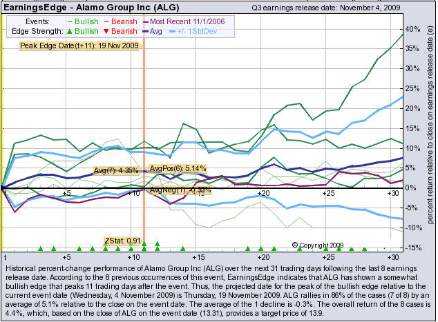 According to the 8 previous November earnings reports, ALG has shown a bullish edge that peaks 11 trading days after the report. ALG rallies in 86% of the cases (7 of 8) by an average of +5.1% relative to the date of the earnings release. At the time this story was written, ALG is +8.26% after earnings were released.