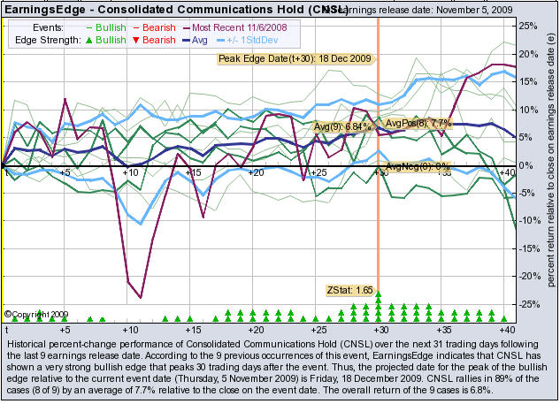 According to the 9 previous quarterly earnings reports, CNSL has shown a bullish edge that peaks 30 trading days after the report. CNSL rallies in 89% of the cases (8 of 9) by an average of +7.7% relative to the date of the earnings release. At the time this story was written, CNSL is +4.85% after earnings were released.