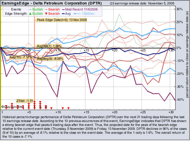 According to the 10 previous quarterly earnings reports, DPTR has shown a bearish edge that peaks 6 trading day after the report. DPTR drops in 90% of the cases (9 of 10) by an average of -8.1% relative to the date of the earnings release. At the time this story was written, DPTR is -10.06% after earnings were released.