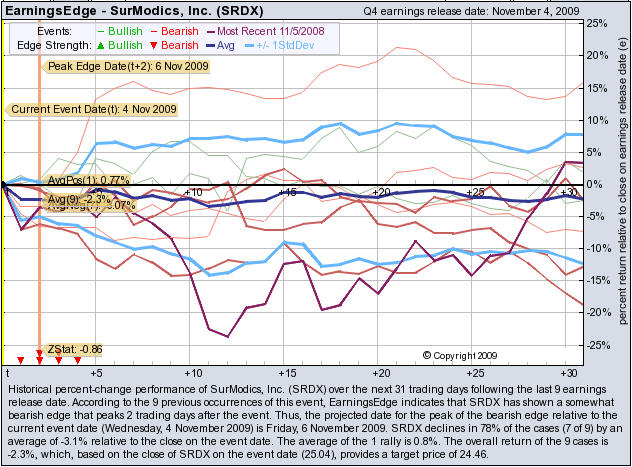 According to the 9 previous quarterly earnings reports, SRDX has shown a bearish edge that peaks 2 trading days after the report. SRDX drops in 78% of the cases (7 of 9) by an average of -3.1% relative to the date of the earnings release. At the time this story was written, SRDX is -4.15% after earnings were released.