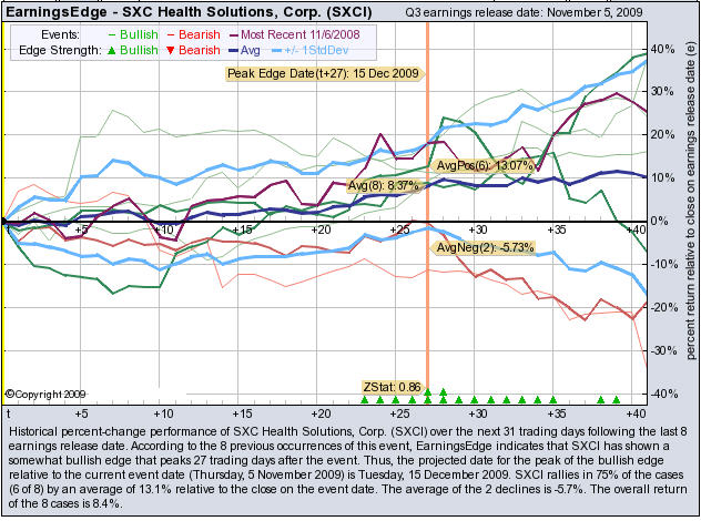 According to the 8 previous quarterly earnings reports, SXCI has shown a bullish edge that peaks27 trading days after the report. SXCI rallies in 75% of the cases (6 of 8) by an average of +13.1% relative to the date of the earnings release. At the time this story was written, SXCI is +7.1% after earnings were released.