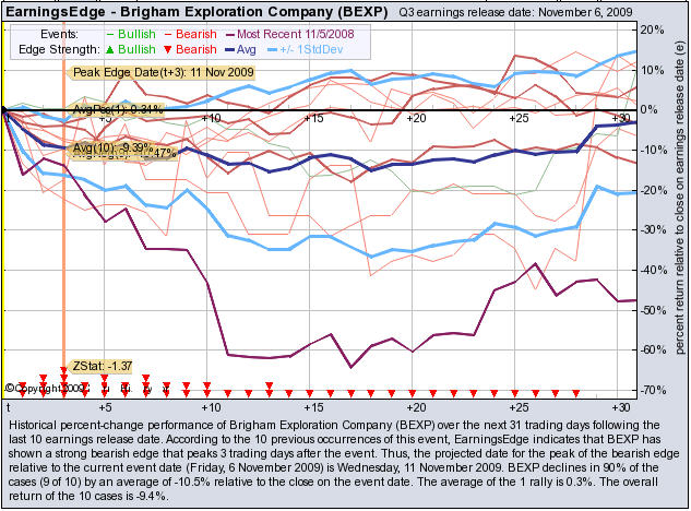 According to the 10 previous November earnings reports, BEXP has shown a bearish edge that peaks 3 trading days after the report. BEXP drops in 90% of the cases (9 of 10) by an average of -10.5% relative to the date of the earnings release. At the time this story was written, BEXP is -7.17% after earnings were released.