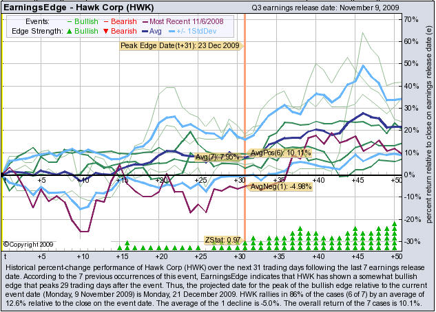 According to the 7 previous November earnings reports, HWK has shown a bullish edge that peaks 29 trading days after the report. HWK rallies in 86% of the cases (6 of 7) by an average of +12.6% relative to the date of the earnings release. At the time this story was written, HWK is +7.26% after earnings were released.