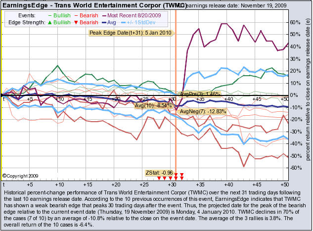 According to the 10 previous quarterly earnings reports, TWMC has shown a bearish edge that peaks 30 trading days after the report. TWMC drops in 70% of the cases (7 of 10) by an average of -10.8% relative to the date of the earnings release. At the time this story was written, TWMC is -8.26% after earnings were released.