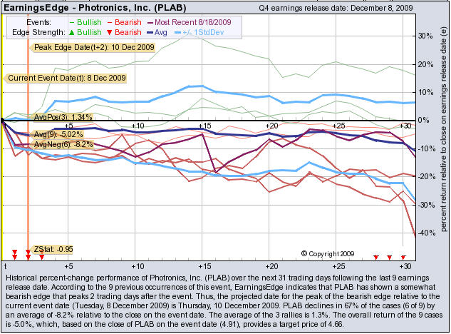 According to the 9 previous quarterly earnings reports, PLAB has shown a bearish edge that peaks 2 trading days after the report. PLAB drops in 67% of the cases (6 of 9) by an average of -8.2% relative to the date of the earnings release. At the time this story was written, PLAB is -10.59% after earnings were released.