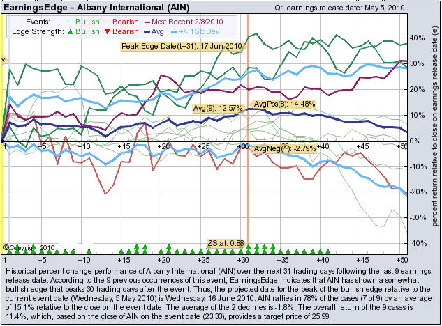 According to the 9 previous quarterly earnings reports, (NYSE: AIN) has shown a bullish edge that peaks 30 trading days after the report. AIN rallies in 78% of the cases (7 of 9) by an average of +15.1% relative to the date of the earnings release. At the time this story was written, AIN is +2.57% immediately after earnings were released.