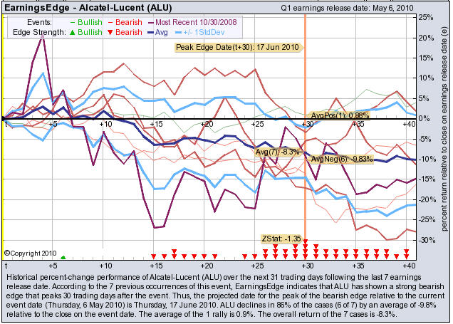 According to the 7 previous quarterly earnings reports, ALU has shown a bearish edge that peaks 30 trading days after the report. ALU drops in 86% of the cases (6 of 7) by an average of -9.8% relative to the date of the earnings release. At the time this story was written, ALU is -10.27% immediately after earnings were released.