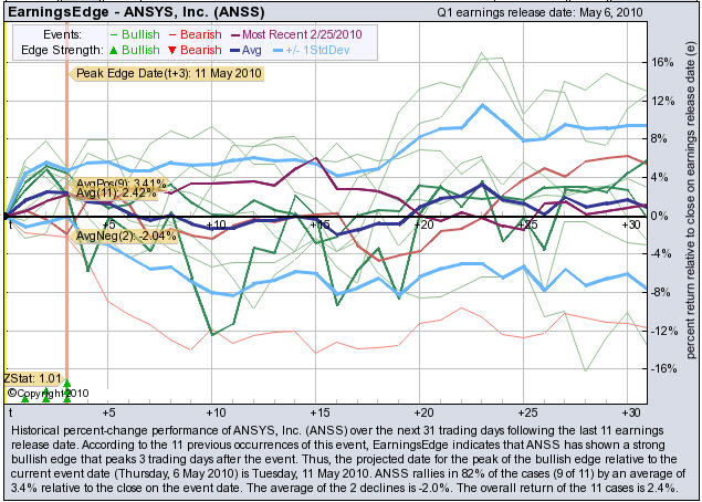 According to the 11 previous quarterly earnings reports, (NASDAQ: ANSS) has shown a bullish edge that peaks 3 trading days after the report. ANSS rallies in 82% of the cases (9 of 11) by an average of +3.4% relative to the date of the earnings release. At the time this story was written, ANSS is +1.34% immediately after earnings were released.
