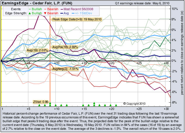 According to the 19 previous quarterly earnings reports, (NYSE: FUN) has shown a bullish edge that peaks 9 trading days after the report. FUN rallies in 84% of the cases (16 of 19) by an average of +2.7% relative to the date of the earnings release. At the time this story was written, FUN is +3.31% immediately after earnings were released.
