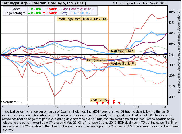 According to the 8 previous quarterly earnings reports, EXH has shown a bearish edge that peaks 20 trading days after the report. EXH drops in 75% of the cases (6 of 8) by an average of -8.2% relative to the date of the earnings release. At the time this story was written, EXH is -6.88% immediately after earnings were released.