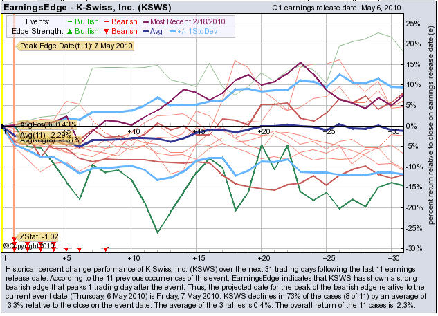 According to the 11 previous quarterly earnings reports, KSWS has shown a bearish edge that peaks 1 trading day after the report. KSWS drops in 73% of the cases (8 of 11) by an average of -3.3% relative to the date of the earnings release. At the time this story was written, KSWS is -17.28% immediately after earnings were released.