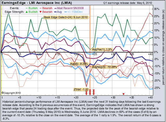 According to the 6 previous May earnings reports, LMIA has shown a bearish edge that peaks 24 trading days after the report. LMIA drops in 70% of the cases (5 of 6) by an average of -10.3% relative to the date of the earnings release. At the time this story was written, LMIA is -2.98% immediately after earnings were released.