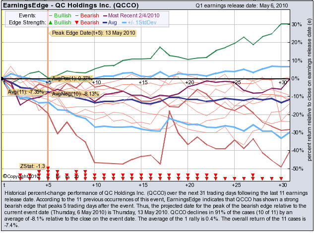 According to the 11 previous quarterly earnings reports, QCCO has shown a bearish edge that peaks 5 trading days after the report. QCCO drops in 91% of the cases (10 of 11) by an average of -8.1% relative to the date of the earnings release. At the time this story was written, QCCO is -12.55% immediately after earnings were released.