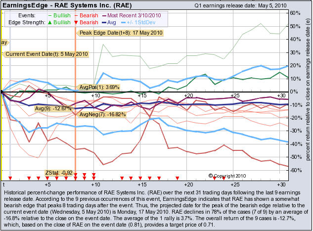 According to the 9 previous quarterly earnings reports, RAE has shown a bearish edge that peaks 8 trading days after the report. RAE drops in 78% of the cases (7 of 9) by an average of -16.8% relative to the date of the earnings release. At the time this story was written, RAE is -3.72% immediately after earnings were released.