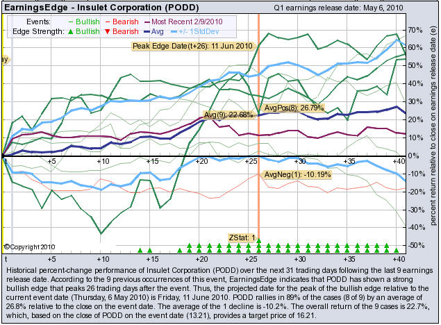 According to the 9 previous quarterly earnings reports, (NASDAQ: PODD) has shown a bullish edge that peaks 26 trading days after the report. PODD rallies in 89% of the cases (8 of 9) by an average of +26.8% relative to the date of the earnings release. At the time this story was written, PODD is +7.15 immediately after earnings were released.