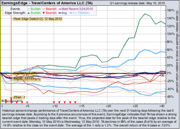 According to the 9 previous quarterly earnings reports, TA has shown a bearish edge that peaks 2 trading days after the report. TA drops in 89% of the cases (8 of 9) by an average of -14.8% relative to the date of the earnings release. At the time this story was written, TA is -4.02% immediately after earnings were released.