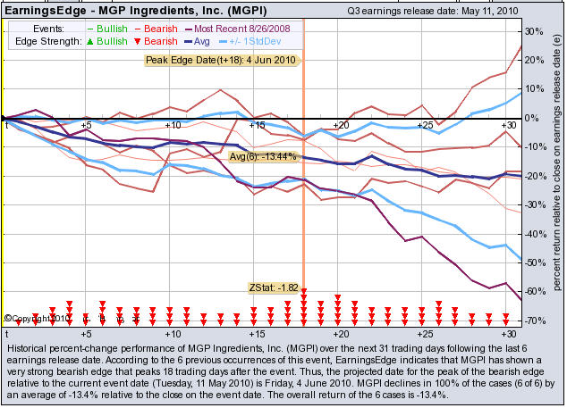 According to the 6 previous quarterly earnings reports, MGPI has shown a bearish edge that peaks 18 trading days after the report. MGPI drops in 100% of the cases (6 of 6) by an average of -13.4% relative to the date of the earnings release. At the time this story was written, MGPI is -7.15% immediately after earnings were released.