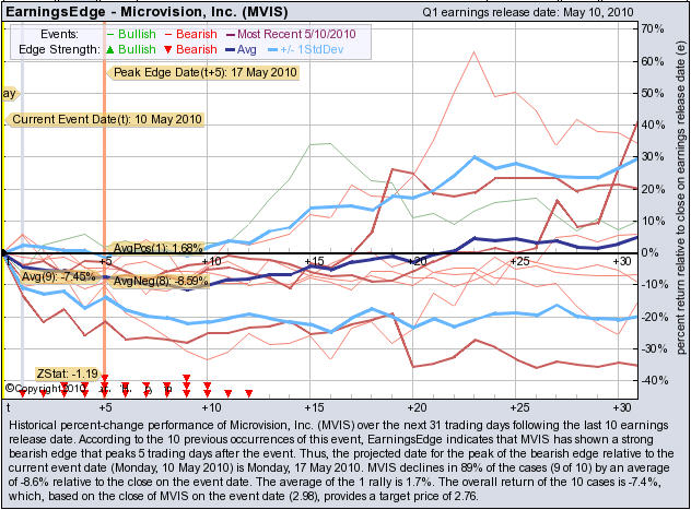 According to the 12 previous quarterly earnings reports, MVIS has shown a bearish edge that peaks 19 trading days after the report. MVIS drops in 91% of the cases (11 of 12) by an average of -12.3% relative to the date of the earnings release. At the time this story was written, MVIS is -2.34% immediately after earnings were released.