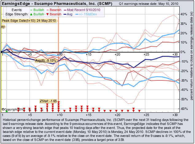 According to the 9 previous quarterly earnings reports, SCMP has shown a bearish edge that peaks 10 trading days after the report. SCMP drops in 100% of the cases (9 of 9) by an average of -12.3% relative to the date of the earnings release. At the time this story was written, SCMP is -2.03% immediately after earnings were released.