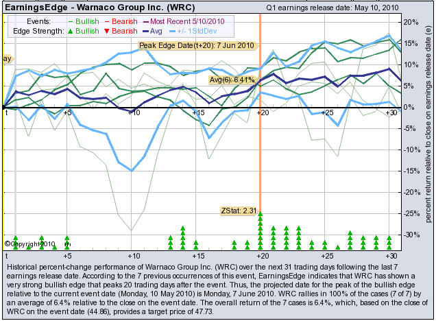 According to the 7 previous quarterly earnings reports, (NYSE: WRC) has shown a bullish edge that peaks 20 trading days after the report. WRC rallies in 100% of the cases (7 of 7) by an average of +6.4% relative to the date of the earnings release. At the time this story was written, WRC is +2.34% immediately after earnings were released.