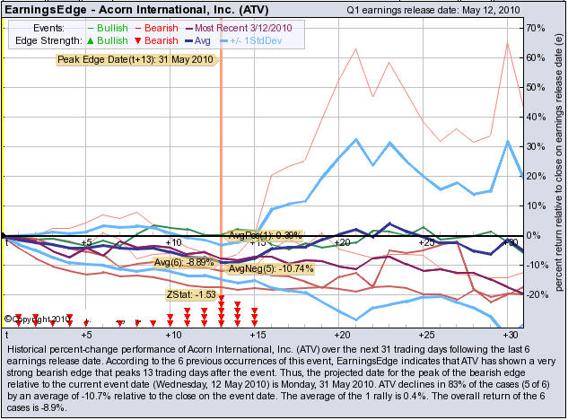 According to the 6 previous quarterly earnings reports, ATV has shown a bearish edge that peaks 13 trading days after the report. ATV drops in 83% of the cases (5 of 6) by an average of -10.7% relative to the date of the earnings release. At the time this story was written, ATV is -8.41% immediately after earnings were released.
