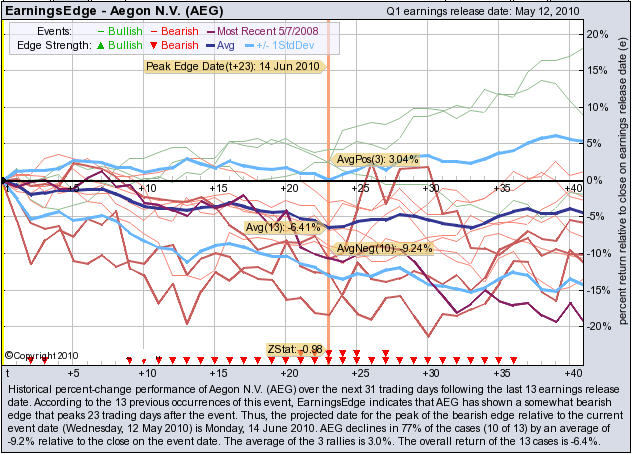 According to the 13 previous May earnings reports, AEG has shown a bearish edge that peaks 23 trading days after the report. AEG drops in 77% of the cases (10 of 13) by an average of -9.2% relative to the date of the earnings release. At the time this story was written, AEG is -0.61% immediately after earnings were released.