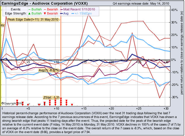 According to the 7 previous quarterly earnings reports, VOXX has shown a bearish edge that peaks 11 trading days after the report. VOXX drops in 100% of the cases (7 of 7) by an average of -8.3 relative to the date of the earnings release. At the time this story was written, VOXX is -3.02% immediately after earnings were released.