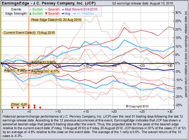 According to the 12 previous quarterly earnings reports, JCP has shown a bearish edge that peaks 5 trading days after the report. JCP drops in 91% of the cases (11 of 12) by an average of -4.8 relative to the date of the earnings release. At the time this story was written, JCP is -2.02% immediately after earnings were released.