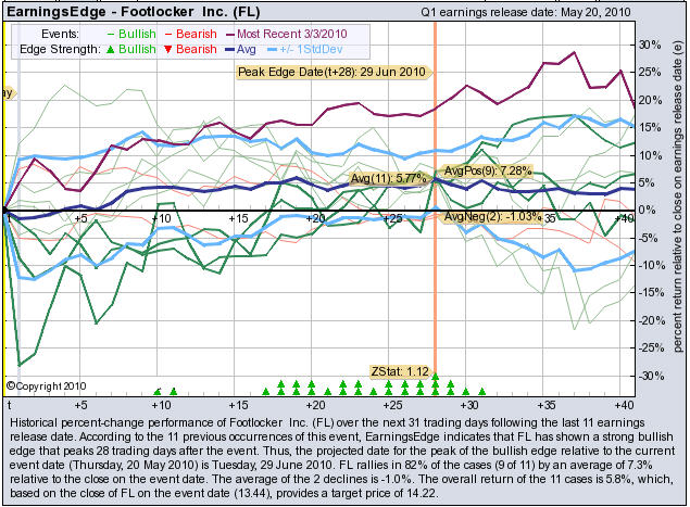 According to the 11 previous quarterly earnings reports, (NYSE: FL) has shown a bullish edge that peaks 28 trading days after the report. FL rallies in 82% of the cases (9 of 11) by an average of +7.3% relative to the date of the earnings release. At the time this story was written, FL is +3.94% immediately after earnings were released.