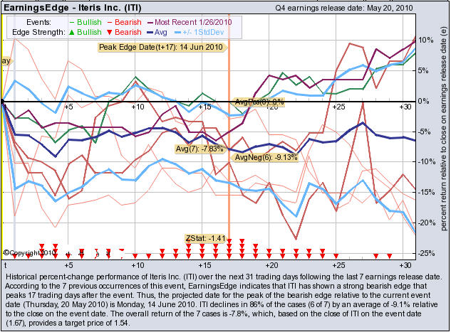 According to the 7 previous quarterly earnings reports, ITI has shown a bearish edge that peaks 17 trading days after the report. ITI drops in 86% of the cases (6 of 7) by an average of -9.1% relative to the date of the earnings release. At the time this story was written, ITI is -4.78% immediately after earnings were released.