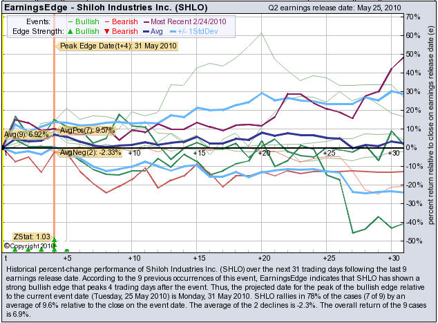 According to the 9 previous quarterly earnings reports, (NASDAQ: SHLO) has shown a bullish edge that peaks 4 trading days after the report. SHLO rallies in 78% of the cases (7 of 9) by an average of +9.6% relative to the date of the earnings release. At the time this story was written, SHLO is +5.39% immediately after earnings were released.