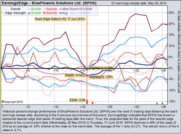 According to the 6 previous May earnings reports, BPHX has shown a bearish edge that peaks 16 trading days after the report. BPHX drops in 83% of the cases (5 of 6) by an average of -3.8% relative to the date of the earnings release. At the time this story was written, BPHX is -3.33% immediately after earnings were released.