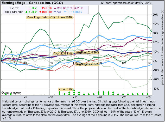 According to the 11 previous quarterly earnings reports, (NYSE: GCO) has shown a bullish edge that peaks 15 trading days after the report. GCO rallies in 91% of the cases (10 of 11) by an average of +9.3% relative to the date of the earnings release. At the time this story was written, GCO is +3.31% immediately after earnings were released.