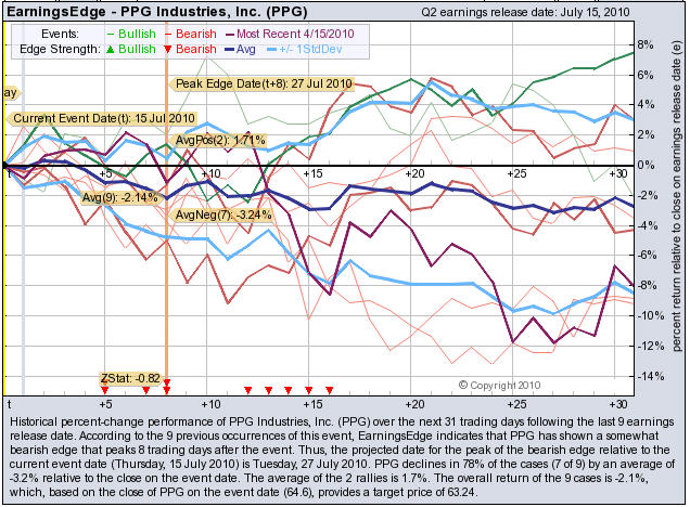 According to the 9 previous July earnings reports, PPG has shown a bearish edge that peaks 8 trading days after the report. PPG drops in 78% of the cases (7 of 9) by an average of -3.2% relative to the date of the earnings release. At the time this story was written, PPG is -1.8% immediately after earnings were released.