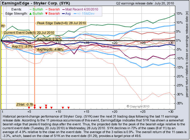 According to the 11 previous quarterly earnings reports, SYK has shown a bearish edge that peaks 6 trading days after the report. SYK drops in 73% of the cases (8 of 11) by an average of -4.9% relative to the date of the earnings release. At the time this story was written, SYK is -4.33% immediately after earnings were released.