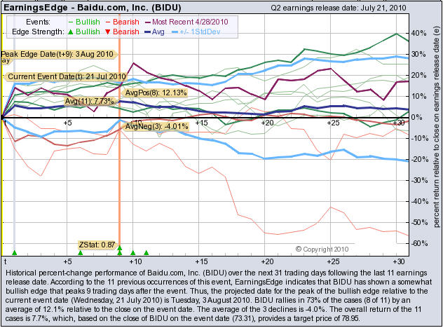 According to the 11 previous quarterly earnings reports, (NASDAQ: BIDU) has shown a bullish edge that peaks 9 trading days after the report. BIDU rallies in 73% of the cases (8 of 11) by an average of +12.1% relative to the date of the earnings release. At the time this story was written, BIDU is +3.11% immediately after earnings were released.